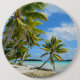 Knöpfen Sie mit einer hängenden Palme auf einem weißen Sandstrand von einer tropischen Insel im Pazifischen Ozean, der dem Tahiti-Archipel Französisch-Polynesien gehört.