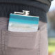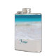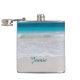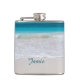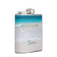 Trinkflasche zum Thema Strand, mit Foto eines weißen Sandstrandes und Wasser blau. Personalisieren Sie den blauen Text für sich selbst oder als eine tolle Geschenkidee für Ihre Brautmädchen und Trauzeugen.