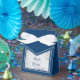 Ein Sandstrand mit vielen Seegras-Stränden, zentrales Foto für eine romantische Hochzeit in Urlaubsort. Gefälligkeitsboxen in einer sauberen Marine und Weiß bringen ein wenig das küstennahe Ambiente zum Gustentisch. Elegante Typografie fügt die letzte Touch hinzu.
