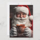 Diese Weihnachtsreise-Flachbild-Karte bietet den fröhlichen Weihnachtsmann, der zu Weihnachten mit einer Tasse im Urlaub lächelt. Der Rücken ist eine leere Creme Farbe, sodass Sie es markieren und Ihre eigene Nachricht schreiben können.