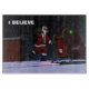 Glaubst du an den Weihnachtsmann? Der Weihnachtsmann steht auf dem Dach eines Hauses, nachdem er Geschenke geliefert hat. Es erscheint auch der Text mit dem Text "I GLAUBE".