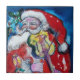 Farbenfrohe, skurrile und künstlerische Acrylmalerei ,Der Weihnachtsmann spielt in der schneebedeckten Winternacht Geige, eine Eule, Blumenschmuck, Winterfrüchte, heilige Beeren in kräftigen Rot-, Grün-, Weiß-, Blau- und Gelbtönen.