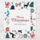Das Weinetikett dieses Ferienhauses zeichnet sich durch den Weihnachtsmann, die Rentiere, die Pinienbäume, die Mitten und die Schneeflocken auf weißem Hintergrund aus. Die Typografie "Frohe Weihnachten" ist in rot und grün. Sie können den Gruß und den Namen personalisieren.