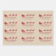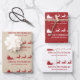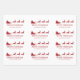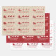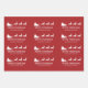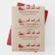 Desteis festliche rote Silhouette-Design eines Weihnachtsmanns in einem Schlitten mit Rentieren, die ihn vorwärts ziehen. Das Design wird mehrmals auf dem Blatt platziert, um ein Muster zu erstellen. Unter jedem Bild befinden sich zwei personalisierbare Textbereiche. Jedes Blatt hat eine etwas andere Farbkombination des Designerrot, die alle zu einem passenden Set zusammenzieht. Sie können die Farben jedoch auf jede andere Farbe ändern, wenn Sie möchten.
