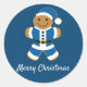 Aufkleber mit einem lächelnden Lebkuchen Santa, in einem blauen Outfit, und die Worte "Frohe Weihnachten". Die Wörter können nach Belieben angepasst werden. Frohe Weihnachten!