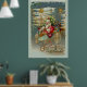 Here comes Santa! He is steering his amazing flying machine through the night sky. Stars, streamers and fancy decorations bedeck the aircraft and its load of wonderful toys for Christmas morning. The restored image of a Victorian postcard features a frosty background, gold accents and beautiful, bright colors. It is framed in icicles and ornaments with a Christmas village in the background.