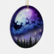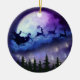 Dieses wunderschöne Keramik-Ornament zeigt eine Silhouette-Illustration des Weihnachtsmannes in einem magischen Schlittenhirsche, der in der Mondnacht über den Weihnachtswald fliegt, riesiger lila Mond mit Krater, blauen und lila Wolken und Sternen.
