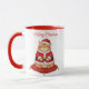 Enjoy your holiday drinks with a smile using this adorable Santa Paws Cat Christmas Mug! This two-tone ceramic mug features a festive red handle and interior trim, perfectly complementing the delightful design. The illustration showcases a fluffy, happy orange tabby cat dressed as Santa Claus, sitting on a soft red velvet pillow. Above the charming feline is the elegant cursive text, "Merry Christmas."