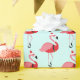 Neuartiges Weihnachtspapier mit einem Muster aus rosa Flamingos in Santa Outfits auf blauem Hintergrund.