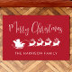 Feierliche saisonale rote Tür für Ihre Weihnachtsfeiertage Dekoration, die Rentiere, die den Schlitten des Weihnachtsmanns durch die Luft fliegen, "Frohe Weihnachten" in einem modernen weißen Drehbuch und Ihren Namen in einfache weiße Typografie.