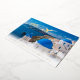 Enregistrez la carte postale Date 5x7 avec de véritables accents or, argent ou or rose pour un mariage de Santorin, Grèce Destination Mariage avec les bâtiments à coupole bleu et blanc classique sur le rivage et un logo de voyage amusant et créatif de destination de thème de voyage avec des initiales et mariage date dans un avion de conception de sentiers cardiaques. REMARQUE : monogramme de l'avion et empreintes de texte en papier REAL sur l'encre plate standard, image arrière - plan couleur. Imprime sur le dos avec toute l'encre standard. Contactez le concepteur Destinations de raisins papier pour obtenir de l'aide sur la coordination des éléments, ou utilisez le "transfert de cette conception" pour créer votre propre produit Zazzle.