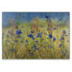 In einem goldenen Grasfeld blühen lebendige blaue Zichorie und Maisblumen unter einem blass blauen Himmel. Der blonde und grüne Hintergrund wird auch durch das glitzernde Rosa der Blume des Rasens unterbrochen.