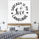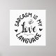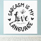 A playful and humorous circular typography design featuring the phrase, "Sarcasm Is My Love Language." The word "Love" is in a central, flowing script with small decorative hearts and a leaf motif, while the surrounding text is in a clear, bold, all-caps font. This design is perfect for those who express affection and humor through sarcasm.