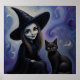 Eine junge Hexe mit großen, ausdrucksvollen Augen sitzt neben einer schwarzen Katze, beide umhüllt in einem geheimnisvollen, wirbelnden blauen und lila Hintergrund. Ihr spitzer Hut und die goldenen Augen der Katze verleihen der Szene eine bezaubernde Touch. Dieses Plakat ist in einem Ölfarbe gedruckt.