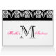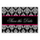 Le monogramme de damassé de noir et de roses indien sauvent les cartes de date. Customisez sur l'intérieur avec votre information de mariage utilisant les invites ou choisissez la "personnaliser" pour plus d'options de édition. Disposition et conception d'Elke Clarke ©2010. Motif de damassé autorisé pour l'usage commercial. Aucune duplication permise.
