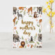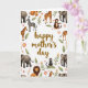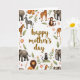 Diese Karte zeigt die Worte „Happy Mother’s Day“ zentriert in einem fließenden, gebräunten Goldstil, der sich klar von einem weißen Hintergrund abhebt. Um die Nachricht herum bildet ein Ring aus Safari-Tieren einen gemütlichen Rahmen, wobei sanfte Elefanten, ruhige großkatzen mit Mähnen und hohe gefleckte Giraffen sich nach innen neigen, als ob sie einen stillen Moment miteinander teilen ❤️. Gestreifte Zebras und kleine Affen bringen Bewegung hinein, einige sitzen auf blättrigen Ästen, als ob sie das Grußwort bewachen. Zwischen den Tieren schaffen weiche rosa Blumen mit sonnengelben Zentren und Zweige mit hellorangenen Blüten eine gartenähnliche Umrandung, die sich pflegend und nah anfühlt. Die Grüntöne reichen von frischen Blattfarben bis hin zu tieferen Schattierungen und helfen dabei, dass die warmen Tierfarben erdverbunden und natürlich wirken. Der Hauptext bleibt in der Mitte, während die Illustrationen größtenteils entlang der Ränder bleiben und offenen Raum lassen, damit das Design