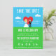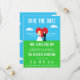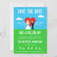 Ce faire-part amusant, unique et délicieusement geeky sauver la date mariage dispose de 8-bit marié (avec cheveux blonds) et personnages de mariés se regardant devant un coeur rouge, avec un ciel bleu vif avec des nuages blancs moelleux de 8-bit.