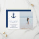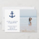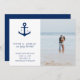 Photo nautique enregistrer les dates avec votre photo verticale préférée sur la droite. Sur la gauche se trouve une ancre bleu marine avec votre monogramme de chaque côté. Voici vos noms et les mots "lient le noeud", sur un arrière - plan blanc. L'arrière est assortie d'une teinte bleu marine. Ce design simple est parfait pour un mariage à la plage en été.