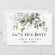 Elégante Aquarelle moderne Botanique Verdure Fiançailles Mariage Enregistrer La Carte Date comprend des feuilles d'eucalyptus, vert feuillage botanique, feuilles bleus poussiéreux et d'autres belles verdure botanique. Sage Green Back.