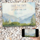 Mariage de montagne enregistrer la carte de date avec l'aquarelle pittoresque design dans les tons bleu et vert poussiéreux. Le paysage au bord du lac comprend des montagnes, de la verdure et des pins, le lac et un ciel clair. Le texte est modifiable et si vous souhaitez faire correspondre des produits, veuillez parcourir ma collection Mountain Lake.