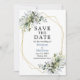 Elégante aquarelle moderne Botanique Verdure Enregistrer La Carte Date comprend des feuilles d'eucalyptus, le feuillage botanique vert, des feuilles bleus poussiéreux et d'autres belles verdure botanique. Cadre géométrique Or.