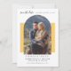 Mariage moderne et élégant enregistrer la carte faire-part date dispose d'un design moderne et minimaliste avec une photo en arc encadrée par une autre forme de bloc de couleur géométrique en jaune marigé - qui complète l'arrière - plan imprimé sur le côté arrière de la carte. Personnalisez le texte personnalisé simple et élégant avec tous les détails importants, y compris la date du mariage, les noms des mariées et mariées, l'emplacement de la cérémonie, et le site Web du mariage. Couleur classique noir et blanc avec couleur or marigold / moutarde jaune accent.
