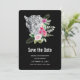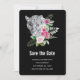 Enregistrez la carte de date avec une belle illustration représentant un portrait léopard gris, noir et blanc. Ce bel animal est entouré d'un bouquet de fleurs tropicales. Élégant, exotique et joli.