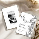 This beautiful floral Save the Date features black and white floral with beautiful calligraphy script on the front and a photo of the couple on the back. To customize, simply click "Personalize This Design," upload your photo, and enter your details. Zazzle will take care of the rest.
