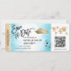 Destination Beach Wedding Boarding Pass Ticket Gold Flugzeug Save the Date mit Kreuzfahrtschiff Icon mit tropischen Blätter. QR-Code hinzufügen