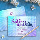 Assurez-vous que tous vos amis et parents pourront célébrer le Bat mitzvah de votre fille! Envoyez cette carte de faire-part amusante, boho retro, personnalisée "Save the Date". Une typographie violette et bleu marine amusante, tendance et audacieuse, avec une typographie sans serif moderne, recouvre un arrière - plan de rayons bleu clair turquoise et violet foncé avec des points blancs. Personnalisez le texte personnalisé avec le nom et la date de votre Bat mitzvah. Votre message personnalisé et une étoile violette de David ornent le dos. Garantie d'ajouter du plaisir élégant à son occasion spéciale! Correspondance et coordination des cartes RSVP, cartes de remerciement, étiquettes de adresse, autocollants, bannières, albums de garde et autres goodies Bat mitzvah sont également disponibles dans cette collection tendance et spéciale. Il suffit de taper le nom, la date et le message personnalisé de votre fille et vous pouvez facilement personnaliser cette carte de faire-part Bat mitzvah "Enregistrer la date". S'il vous plaît, envoyez-moi un message avec toute question ou demande.