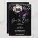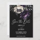 Dark moody boho élégant gothic enregistrer la date modifiable invitation modèle instantanée téléchargement numérique, noir violet pivoines sur arrière - plan foncé enregistrer les détails de l'invitation de date et code RSVP QR à l'arrière