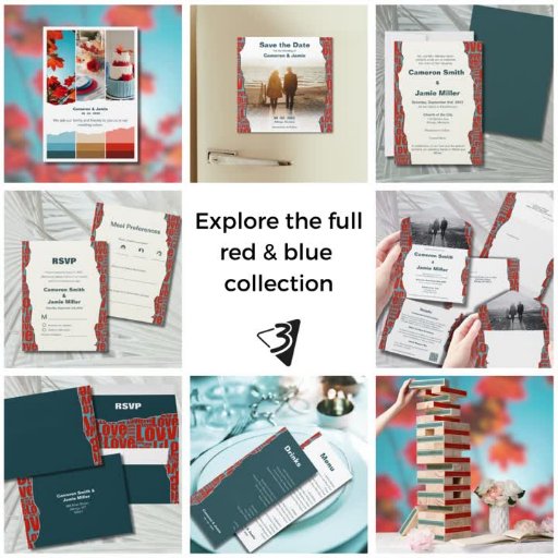 La Red Blue Love Typography Border Save the Date card est une façon élégante d'annoncer votre mariage de automne. La bordure en couleurs chatoyantes en automne fournit un cadre irrégulier pour la zone de texte blanc. Cette zone comprend l'annonce Enregistrer la date, le nom de l'événement spécial, la date, l'emplacement, la promesse que plus d'informations seront fournies, l'adresse du site Web et un code QR pour un accès facile. Le dos est orné d'une image personnalisée du couple tenant la main avec leur nom superposé. Vous pouvez customiser le texte, l'image et le code QR pour rendre la carte unique à votre faire-part mariage. Pour plus d'inspiration en matière de planification mariage, visitez le site www.KBMD3signs.com. Pour toute demande d'assistance ou de conception personnalisée, veuillez nous contacter à l'adresse info@KBMD3signs.com .