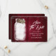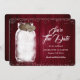 Mariage rustique bordeaux enregistrez la carte de date avec un pot en maçon avec des lampes à cordes et orné de deux coeurs de burlap sur un arrière - plan en bois de grange. Personnalisez facilement ce mariage romantique rustique bordeaux enregistrer la date en ligne. Objets correspondants disponibles pour compléter ce mariage bordeaux enregistrer la date.