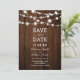 Bois brun rustique et lumières à cordes blanches photo enregistrer la date. Parfait pour un petit mariage décontracté cool pour l'automne et l'hiver, pour un thème de mariage campagnard extérieur de grange.