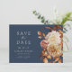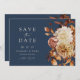 Navy Fall Save the Date. Cet élégant éventail de main programme de mariage est décoré à la main d'aquarelle peinte à la main feuilles d'orange et de terre cuite, dahlias crème et beige, et de beaux roses de couleur rouille sur un arrière - plan de marine. Le dos comprend un bouquet à fleurs et à feuilles assortis avec plus de texte à personnaliser. Trouvez les articles correspondants dans la collection Marine Blue Autumn Romance.