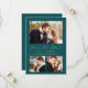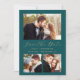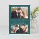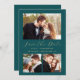 Cette simple et minimaliste carte Save the Date présente une photo horizontale au-dessus des mots "Save the Date" dans un élégant script d'écriture dorée, suivi des noms du couple, date mariage et ville en sans serif police sur un arrière - plan bleu turquoise. Deux photos carrés plus petites apparaissent au bas de la carte. Ajoutez un message plus détaillé avec des informations supplémentaires au verso, ainsi qu'un code QR pour aider vos invités à visiter votre site Web mariage.