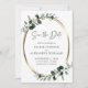 Mis à jour QR Code Eucalyptus Gold Metallic Wedding Enregistrer la date Invitation... Notre luxueuse carte Botanique Save the Date présente un cadre or métallique ovale agrémenté de feuilles d'eucalyptus vert poussiéreux et émeraude créant une bordure naturelle pour le texte faire-part à l'intérieur. Le dos de la carte contient les informations de votre site Web mariage et un modèle graphique de code QR que vous pouvez remplacer par votre propre code simplement en tapant votre URL de site Web mariage. Tous les exemples de texte (sauf pour Enregistrer la date) peuvent être facilement révisés avec vos propres détails sur le modèle de personnalisation.