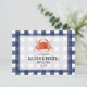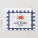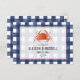 Un mariage nautique rustique sauvez la date avec l'illustration d'un crabe rouge sur un motif patiné bleu en vichy avec du texte noir sur le devant.