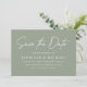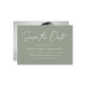 Enregistrez simplement la carte de date avec "Save the Date" dans un script blanc manuscrit avec un arrière - plan vert sage. Personnalisez le moderne enregistrer la carte de date en ajoutant vos noms, date mariage, emplacement du mariage, site Web mariage, etc. Le minimaliste enregistrer la carte de date inverse pour afficher votre photo de fiançailles horizontal préférée.