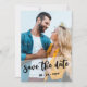 Double face enregistrer la date avec deux photos de portraits pleins de saignement du couple heureux. La photo à l'avant a une superposition translucide, coupée dans un angle géométrique et lettrée à la main avec "enregistrer la date" dans un script de brosse rebondissant. La photo à l'arrière a une superposition de style imitation vellum complète pour tenir vos noms, date mariage et toute information supplémentaire que vous souhaitez fournir à cette étape.