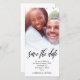 Enregistrez le carte photo de date personnalisé avec votre propre photo romantique. Enregistrez la date écrite dans un magnifique script noir au-dessus de votre date de mariage et des informations supplémentaires pour vos futurs invités mariages. Le bord entre photo mariage et texte est adouci par un dégradé blanc. Ajoutez aussi vos noms !