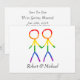 Cette carte de save the date présente un design beau et simple pour annoncer votre mariage imminent. Le graphique représente deux hommes, sous la forme de silhouettes élégantes, se tenant par la main. Les silhouettes sont colorées dans un bel arc-en-ciel, symbolisant l'amour et la diversité. Cette carte est un excellent moyen d'apporter une touche cohérente et significative à votre papeterie tout en offrant à vos invités un moyen clair et élégant de marquer leurs calendriers.