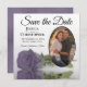 Ces belles fleurs modernes sauvent les cartes datées sont la façon parfaite de faire connaître à vos amis et votre famille votre prochain mariage. Elles présentent un design élégant avec un seul rose à long tige poussiéreux pourpre ou lavande réfléchissant dans un bassin d'eau avec des vagues et ondulant avec votre photo dans un cadre ovale sur un arrière - plan blanc classique. La légende indique Enregistrer la date avec de l'espace pour vos noms, la date et l'emplacement. Le dos est marbré violet gris.
