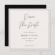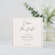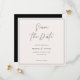 Mariage carré moderne et classe Enregistrer la Date avec manuscrit Typographie Script, arrière - plan blanc crème, un cadre élégant sur le devant et un dossier noir. Customisez-le avec vos propres informations de mariage. Une Faire-part Mariage contemporaine pour les couples modernes.