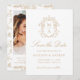Make a lasting first impression with this elegant gold monogram save the date card. The front features your custom monogram initials centered within an ornate crest of chinoiserie and baroque-inspired elements, creating a warm and elevated presentation. “Save the Date” is displayed in refined calligraphy, with your names, wedding date, and location shown below in classic serif lettering. The reverse side highlights your vertical engagement photo framed in white, paired with space for your wedding website and QR code. A gold and white chinoiserie-inspired floral pattern with Victorian character adds a luxurious, formal finishing touch.