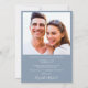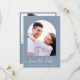 Elégant mariage bleu poussiéreux enregistrer la carte de date avec votre photo dans un cadre d'arc, "enregistrer la date" dans un script blanc chic avec des swashes et vos prénoms et la date mariage rejoint avec un coeur. Au contraire, ajoutez une photo supplémentaire, personnalisez les détails de votre prochain mariage et ajoutez vos noms dans un script signature.