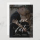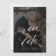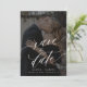 Moderne romantique chic mariage noir moody enregistrer la date modèle avec votre photo personnalisée dans un faux vellum foncé transparent superposition avec blanc classe écriture calligraphie lettrée main. +++++++++++++ Facile à personnaliser avec vos détails et photo fiançailles des deux côtés ! +++++++++++++ Convient pour toute saison de mariage élégant thème.
