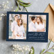 Annoncez vos nouveautés dans le style avec notre Elegant Script photo enregistrer la carte de date. L'élégant save the date card comporte 2 de vos photos fiançailles avec "save the date" dans un script de calligraphie moderne blanc contre un arrière - plan de marine. Personnalisez le simple enregistrement de la carte de date en ajoutant vos noms, date mariage et emplacement du mariage. Le minimaliste enregistrer la carte de date revient à un arrière - plan de marine solide ou une couleur de votre choix.