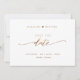Annoncez votre date de mariage avec ce beau mariage, enregistrez la carte de date. Design manuscrit moderne détails de script en bronze en terre cuite faux feuille à l'avant. Retour avec unique Enregistrer le timbre Date/monogramme avec les noms de couples en blanc sur un arrière - plan terre cuite. Style propre et simple. Teracotta rouille et design blanc. Zone pour le site Web mariage, plus d'informations ou/et message pour vos invités (c.-à-d. "Can't wait to see you here!").