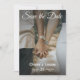 Elegant “Save the Date” wedding design featuring a romantic couple holding hands.